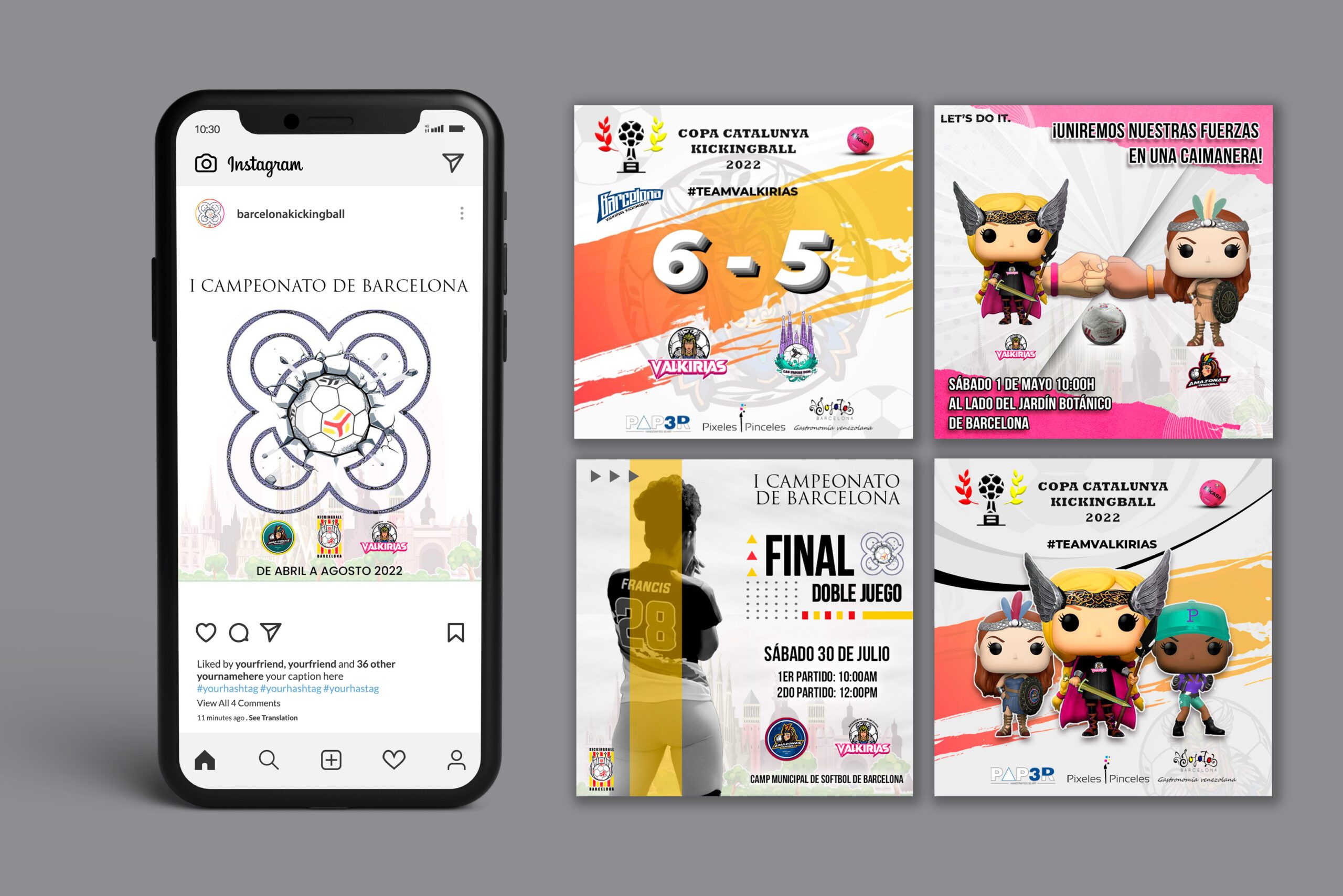 Creación de Logotipo para la Asociación Catalana de Kickingball, creación de figuras personalizadas para cada equipo de España y diseño de redes sociales para los eventos de kickingball a nivel nacional entre los años 2021 y 2023.